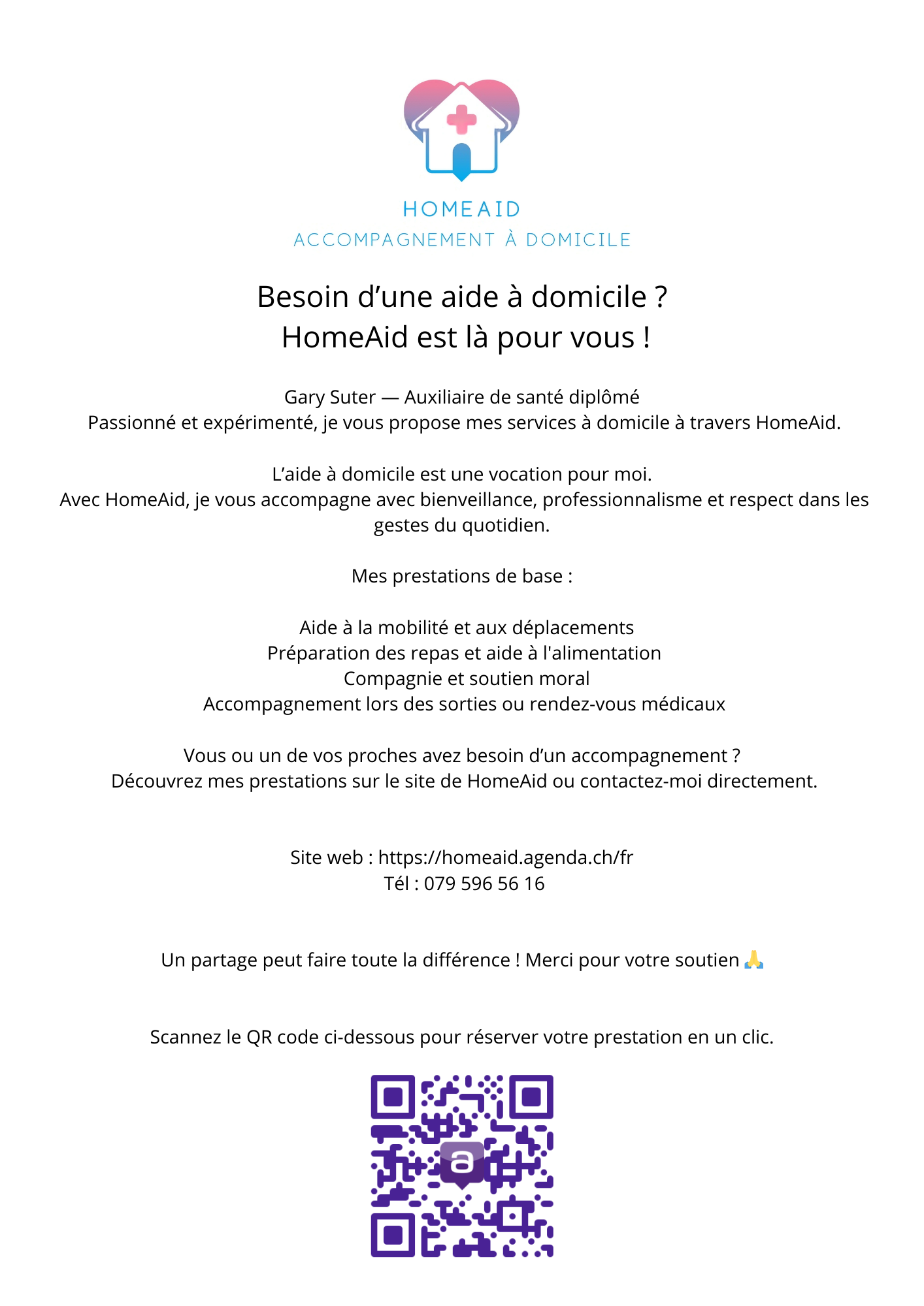 Je m’appelle Gary Suter, aide-soignant diplômé et passionné. Après plusieurs années d’expérience, je me lance aujourd’hui dans une nouvelle aventure : proposer mes services en tant qu’indépendant, à travers HomeAid.