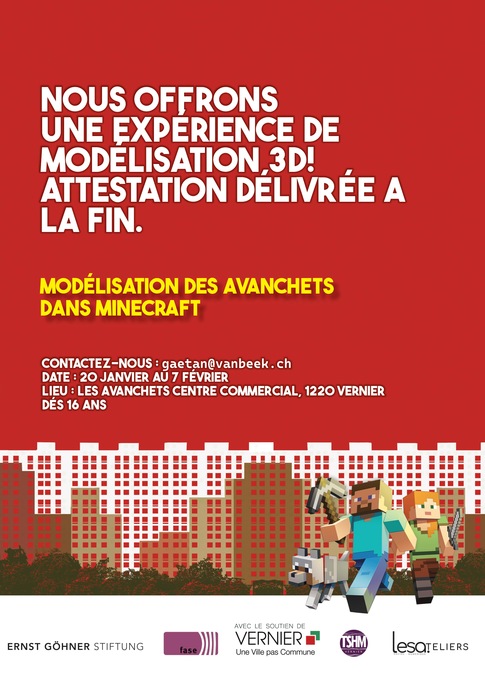 Nous reproduisons le quartier des Avanchets dans le jeu Minecraft et nous avons besoin de participant-e-s bénévoles qui souhaiteraient développer leurs compétences. Une attestation en conception urbanistique 3D est fournie au bout de la démarche.
